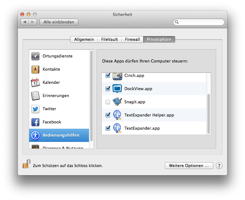 Die Einstellungen nimmt man nämlich nicht mehr unter den Bedienhilfen vor, sondern in den Systemeinstellungen unter „Sicherheit“. Dort wiederum unter „Privatsphäre“ kann man einstellen, welche Apps zugriff auf die Bedienhilfen erhalten. Dazu nachfolgend noch ein Screenshot, der das vielleicht besser erklärt.