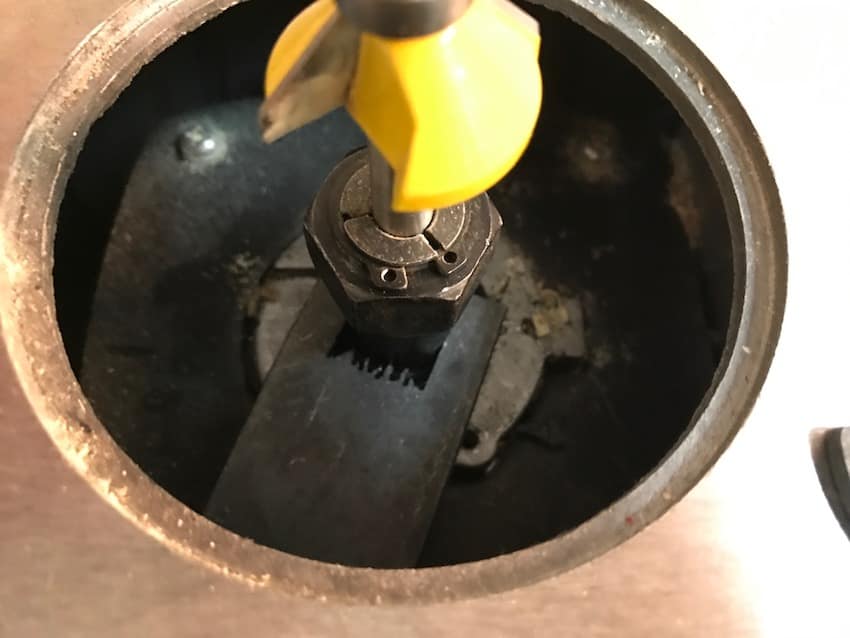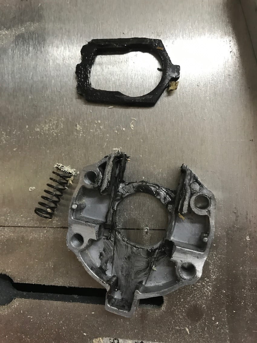 Und so war er vor kurzem bei mir so, dass beim Fräserwechsel wieder die Arretierung hängen blieb und ich somit die Maschine nicht mehr benutzen konnte. Nachdem das mittlerweile die Garantie vorbei war, legte ich mal selber Hand an.