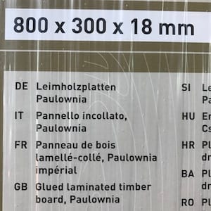 Neben Eiche- und Buchen-Leimholz findet man dort auch Arkazien- und (für mich bis zu diesem Zeitpunkt völlig unbekannt) Paulownia-Leimholz. Und eben diese letzte Sorte wollte ich euch mal hier kurz vorstellen. Paulownia fiel bei mir auf, weil es sehr leicht ist. Paulownia hat nur ungefähr 310 kg pro m2 – Fichte zum Beispiel hat ca. 470 kg pro m2. Dadurch ist diese Holzart auch relativ weich und ich entschied mich, darauf die Opferplatten meiner Shapeoko-Fräse zu machen.