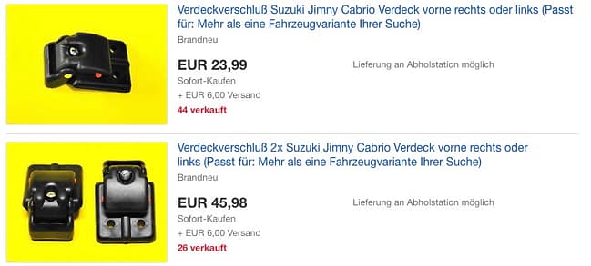 Eine Schwachstelle bei meinen Santana Jimny (so heisst die Cabrio-Variante des Suzuki Jimny) sind die vorderen Verdeckverschlüsse. Diese brechen bei mir, vorzugsweise auf der Beifahrerseite, in einigermassen regelmässigen Abständen. Dabei geht aber nicht der eigentliche „Klapp-Verschluss“ kaputt, sondern nur eines von zwei kleinen (roten) Kunststoff-Teilen, die beim Verschliessen einrasten und den Verschluss arretieren, damit dieser auch zu bleibt.