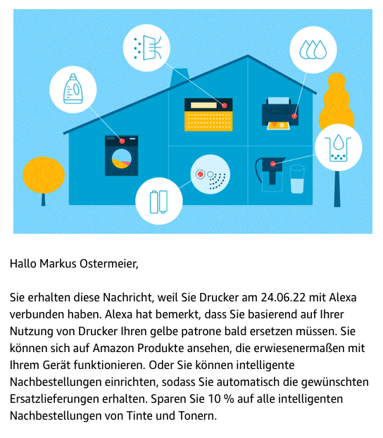 bloging since 1999Was ist denn da los? Wie zur Hölle hat Amazon mitbekommen, dass bei meinem Drucker die Tinte ausgehen würde? Noch dazu, weil ich den Drucker (Canon IP7250) die vergangenen Tage garnicht eingeschaltet hatte?!?! Sehr verwirrend alles!?!?