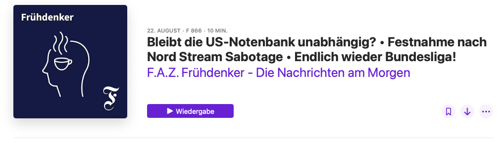 Ich probierte gerade den „F.A.Z. Frühdenker Podcast“ von der „Frankfurter Allgemeinen“ aus und dieser Podcast kommt schon sehr nahe daran, was ich gerne hätte. Mit einer Spieldauer pro Folge, die natürlich täglich erscheint, von maximal um die 10 Minuten, hab ich hier ein Format, dass in meine zeitlichen Vorstellungen passt. Was ich jedoch nach den ersten paar Tagen sagen kann, ist dass der Podcast meiste erst so gegen 6:30 Uhr (evtl. auch etwas später) veröffentlicht wird. Das ist mir etwas zu spät, aber trotzdem bekomme ich so relativ früh meine Nachrichten-Zusammenfassung in einem Umfang, der für mich passend ist.
