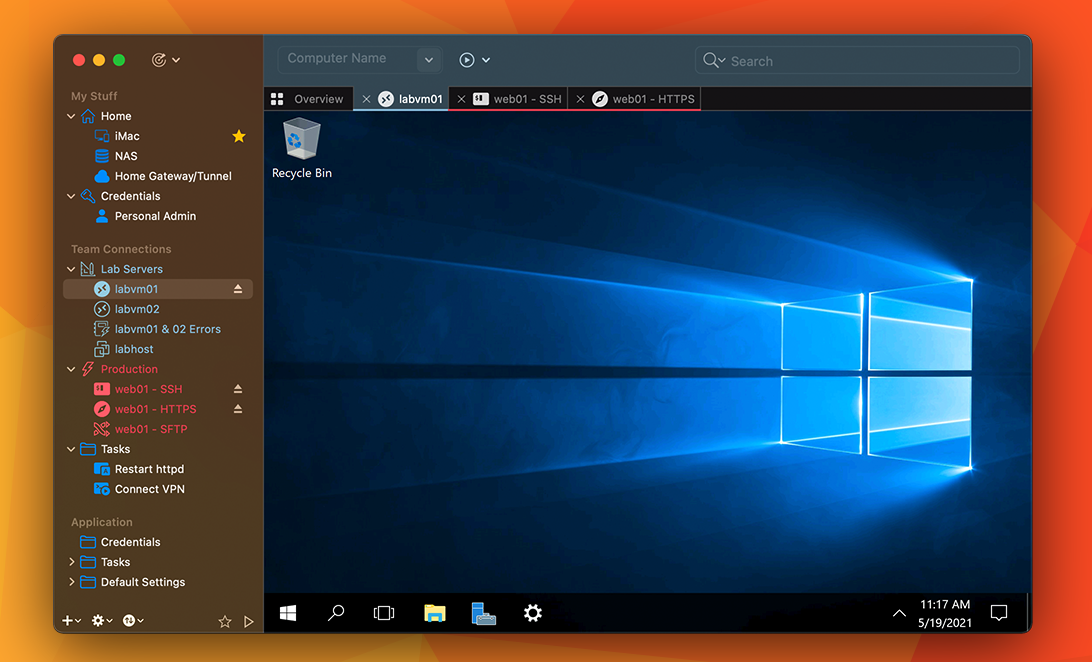 Gerade das Layout bzw. das Design spricht mich bei Royal TSX sehr an. Es erinnert mich an eine ausgewachsene und ausgereifte Mac-App, was sich nach meinem aktuellen Kenntnisstand auch ist. Sie fügt sich wunderbar in der Look&Feel von macOS ein und bereits nach wenigen Tagen der Benutzung kommt es mir irgendwie falsch vor, wenn ich doch noch in Microsoft´s Window-App muss, um dort zum Beispiel noch gespeicherte Hosts zu finden. Was ich jedoch von der Windows-App schon gut fand, war die Integration in die Mac Menü-Leiste. Sowas würde ich mir für Royal TSX auch noch wünschen. Einfach ein kleines Symbol, auf welches man klicken kann und dann zum Beispiel ein ein Suchfeld bekommt, mit dem man die gespeicherten PCs/Server durchsuchen kann. Eine Auflistung dieser Hosts kann bei einer Vielzahl von Einträgen evtl. zu viel werden. Das sprengt dann vielleicht den Platz, den man auf einem Laptop-Bildschirm hat oder wird dann auch schnell unübersichtlich. Also im Grunde ein Spotlight für die gespeicherten Einträge. Ein den Einstellungen der App hat man ein paar Möglichkeiten „farbliche Akzente“ zu setzen, die aktuell nicht sonderlich umfangreich sind. Aber mann kann unter anderen die Farbe von Ordner ändern. Dies habe ich zum Beispiel dafür genutzt, um unterschiedliche Bereiche wie Kunde1, Kunde2 oder Privat besser erkenntlich zu machen, was sich bei mir in der Praxis als sehr nützlich rausgestellt hat. Hier würde ich mir vielleicht noch wünschen, dass man auch die Font ändern könnte oder aber zum Beispiel die Ordner in fett darstellen könnte, damit man hier eine noch bessere Erkennbarkeit erzielen könnte. Aber das sind „Luxusprobleme“ und die aktuellen Möglichkeiten schränken die tägliche Arbeit in keinster Weise ein. Der für mich größte Vorteil der App ist die „Tab-Ansicht“ der geöffneten Verbindungen. Wenn man bei der Windows-App 5-7 RDP-Verbindungen gleichzeitig geöffnet hatte, und das im ungünstigsten Fall auch noch zum Beispiel gleiche Server-Betriebssysteme waren, dann verlor zumindest ich hier schnell die Übersicht, weil ich nicht gleich erkennen konnte, welches Fenster zu welchen Server gehörte. Hier komme ich mit den einzelnen Tabs viel besser zurecht und finde hiermit schneller und „sicherer“ den richtigen Host.