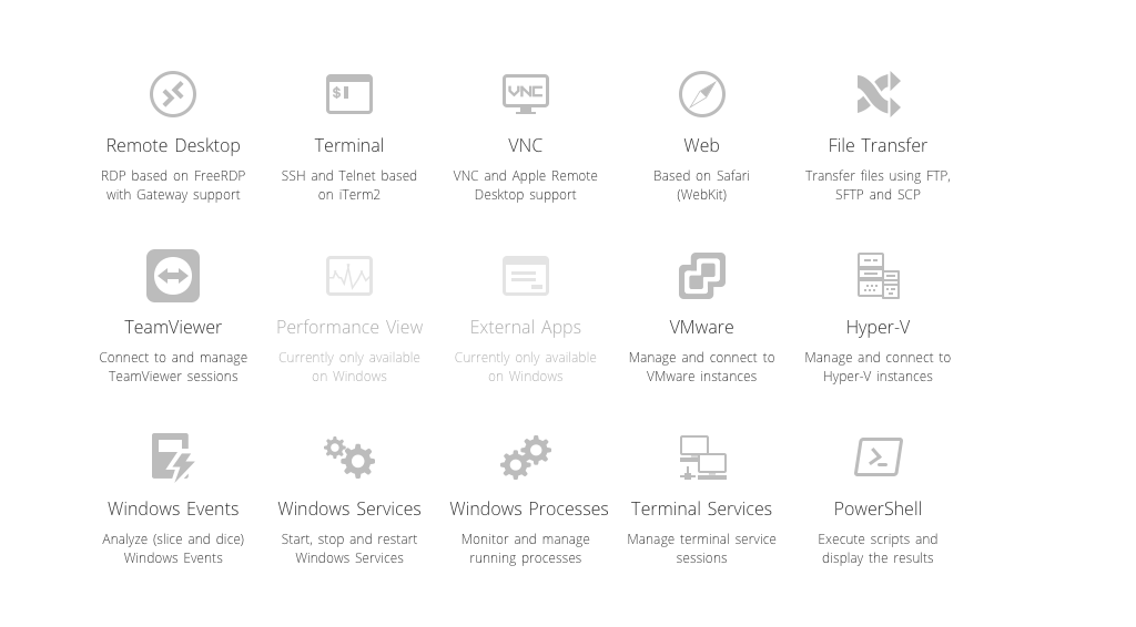 Ich nutze dies zwar derzeit in meinem täglichen Doing noch nicht aus, aber über Royal TSX wäre es möglich auch noch andere Verbindungstypen zu verwalten. So kann man neben den bereits erwähnten RDP-Verbindungen auch noch folgende andere Connections nutzen: Termin, VNC, TeamViewer, VMware, HyperV, Powershell… und viele mehr. Ich hab euch nachfolgend einen Screenshot der Hersteller-Webseite eingebaut, auf dem ihr alle Verbindungstypen ersehen könnt. Ich hab nur mal eine TeamViewer-Verbindung in Royal TSX eingebaut und als ich diese aufbauen wollte, öffnete sich bei mir die „normale TeamViewer“-App. Stand heute würde ich sagen, dass ist so gewollt, da ich mir nicht vorstellen kann, dass TeamViewer zulässt, dass andere Hersteller deren Protokoll zur Fernwartung integrieren dürfen. Die Verbindungsmöglichkeiten zu VMware und einem HyperV-Host möchte ich bei nächster Gelegenheit nochmals testen, da ich auch beruflich immer wieder mit solchen Instanzen zu tun habe und es wäre doch recht schick, wenn man alle Verbindungen in einer App zusammenführen könnte.