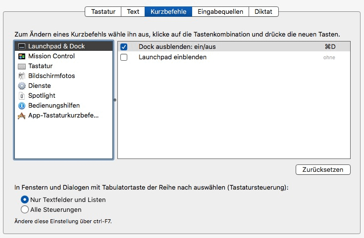 Dort wechselt in der linken Spalte auf „Launchpad und Dock“ und hier habe ich dann bemerkt, dass dieser Shortcut deaktiviert war.