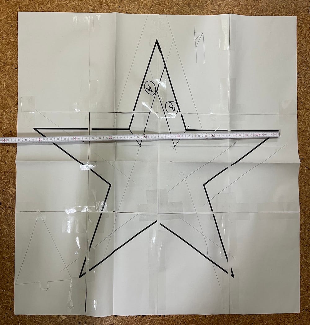 Die Form (ein Stern mit 5 Zacken) ist recht einfach und sehr klassisch und „passt“ in den Weihnachts-Kontext auch sehr gut. Damit ich die Größen besser abschätzen konnte, habe ich mir am Computer ein „Poster“ mit der Stern-Form ausgedruckt. In meinem Fall habe ich dies in Affinity Designer am Mac gemacht, aber das können auch anderen Programme wie zum Beispiel Corel Draw usw.