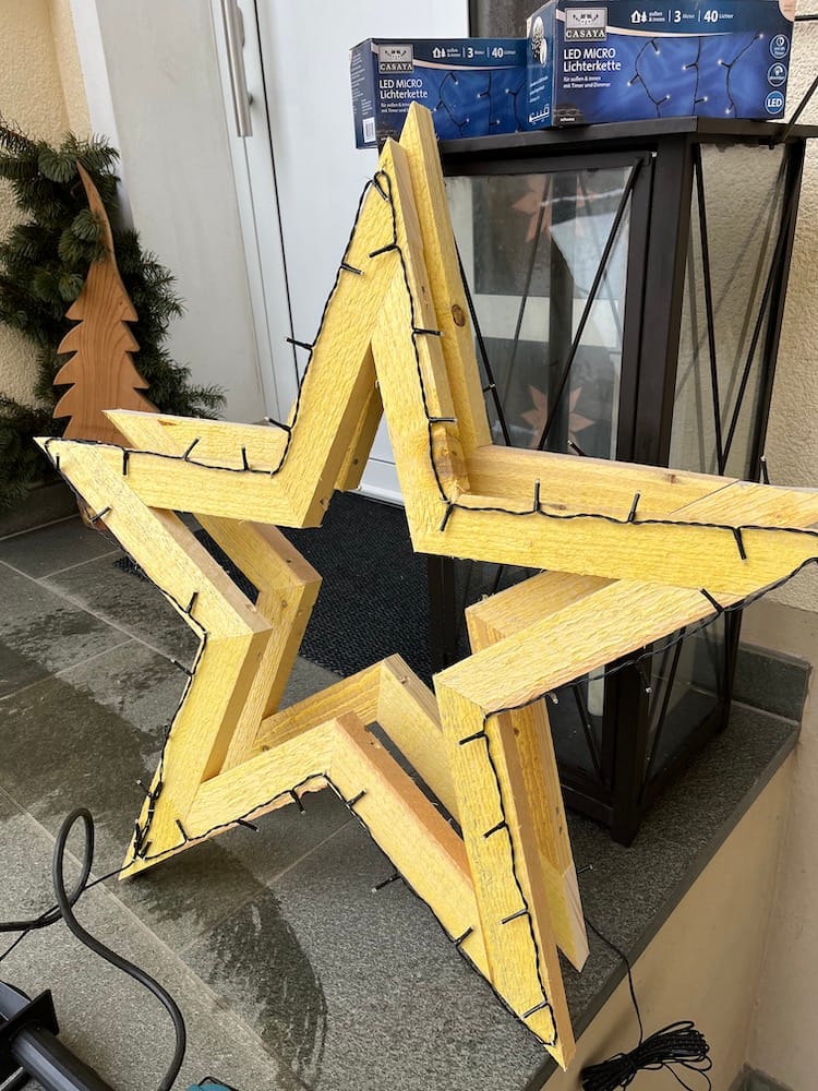 Weil ich schon gefragt wurde. Hier noch ein Amazon-Link für eine Lichterkette für den Holzstern.