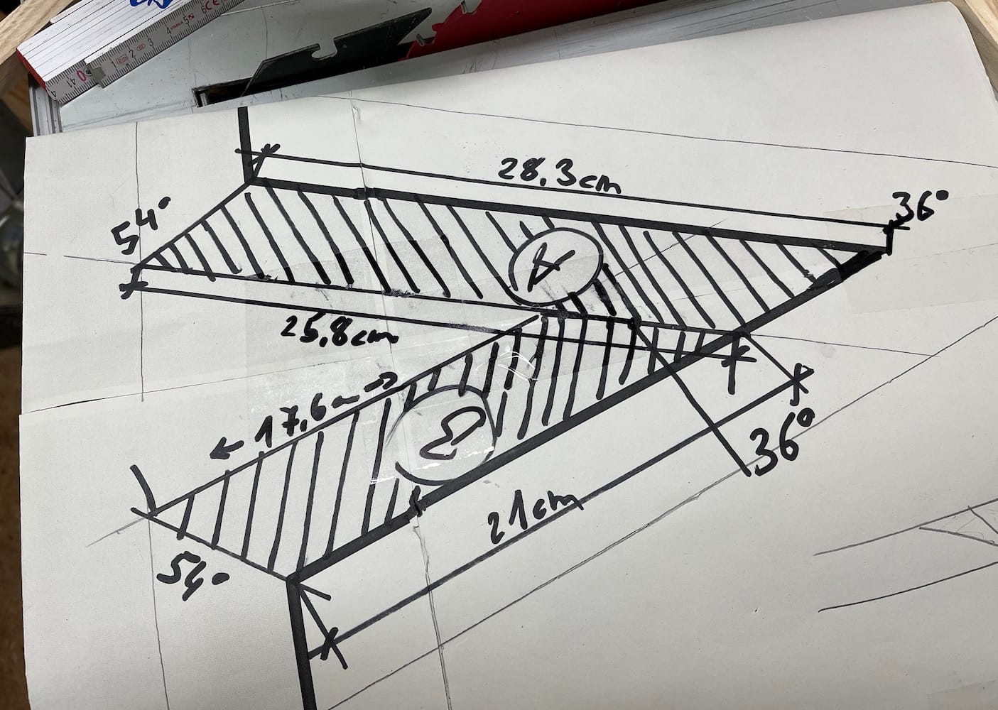 Mit dieser Vorlage aus Papier kann man sich nun recht gut die Winkel und die Maße rausmessen. In unserem Fall braucht man eigentlich nur zwei Winkel. Einmal 36 Grad und dann noch die 54 Grad. Ich habe beide Winkel auf meiner Tischkreissäge geschnitten und dass ging mit dem Schiebeschlitten auch sehr gut. Mit einer Kappsäge könnte das schon etwa schwieriger werden, weil die meisten Modelle, die ich so kenne, gehen nur bis 45 Grad bzw. ein paar Grad darüber hinaus.