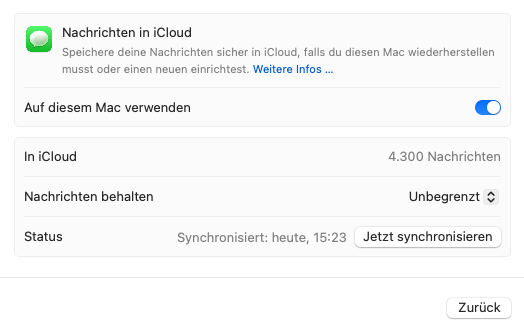 Mac Systemeinstellungen → iCloud Nachrichten Sync Infos.