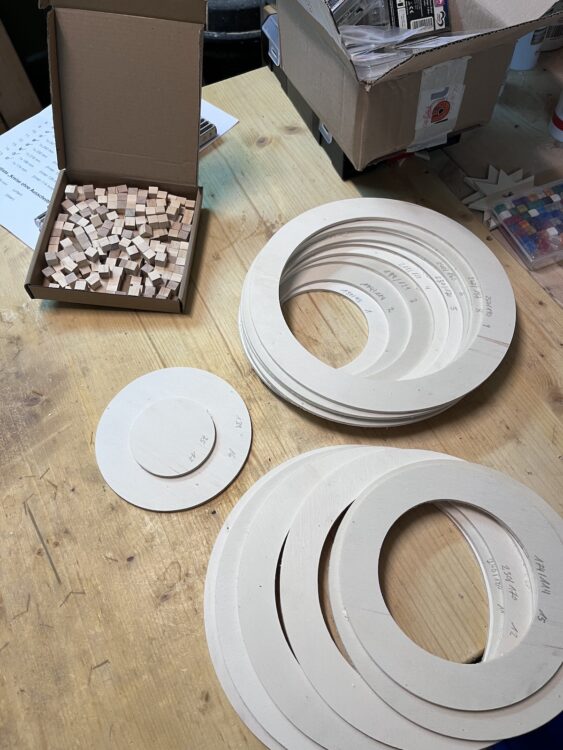 Ich hab jetzt nur mal beim ersten Prototypen mit die Maße der Kreise auf das jeweilige Werkstück geschrieben, damit ich mich dann bei Zusammenbau leichter tue. Die unterste Platte habe ich quasi weg gelassen und fange erst mit der zweiten Schicht hat, damit die Kugel einen besseren Stand hat. Dieser Holzplatte hat dann auch keinen Ausschnitt, damit sie vollflächig stehen kann. Auch die oberste Platte habe ich ohne Ausschnitte jetzt mal geplant, damit hier ein schöner Abschluss vorhanden ist.