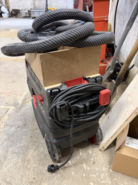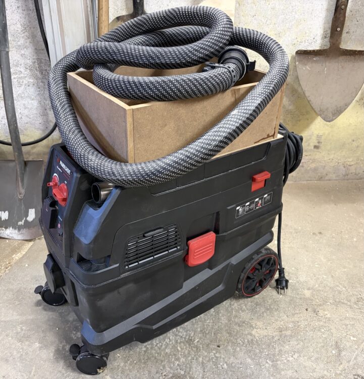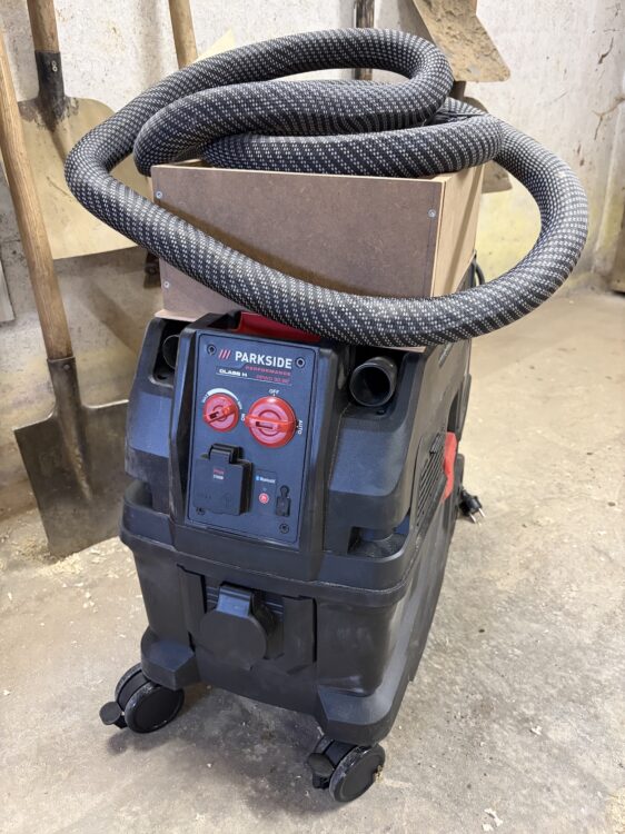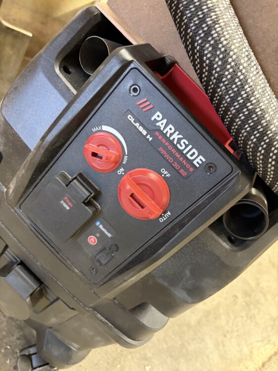 Aber auch sonst bietet der Staubsauger eine Punkte, die ich ganz positiv finde. So hat der Auffangbehälter eine Größe von 30 Litern, was deutlich mehr ist als ein „normaler Nass-Trockensauger“ hat. Das Killer-Feature war für mich der Funk-Handsender, mit welchen man den Sauber „aus der Ferne“ (also auch beim Betrieb von Akku-Werkzeugen) einschalten kann. Die verbesserte Saugleistung und den erhöhten Durchfluss habe ich oben schon erwähnt. Und dann ist direkt am Sauger noch eine USB-C-Buchse verbaut, mit der ihr euer Handy oder die Bluetooth-Box mit max. 10 Watt aufladen könnt. „Natürlich“ ist auch eine normale Schuko-Steckdose noch verbaut, mit der ihr, wenn dort ein Werkzeug angesteckt ist, den Staubsauber automatisch starten lassen könnt. Um im Vergleich zu meinem alten Staubsauber ist das Modell von Parkside auch deutlich leiser und man merkt, dass auf die Geräuschreduzierung Wert gelegt wurde. Der mitgelieferte Schlauch hat eine Länge von 3,5 Metern, was für mich ausreichend ist. Wie Parkside aber auf einem 11 Meter Aktionsradius kommt, ist mir nicht ganz klar – wahrscheinlich haben die die Länge des Stromkabels auch noch dazu gerechnet!!? Und in der Produktbeschreibung wird noch erwähnt, dass sowohl das Kabel, als auch der Schlauch direkt am Gerät verstaut werden kann – das klappt bei mir leider nicht so ganz. Ok, das Kabel kann man mit guten Willen an der „Geräterückseite“ aufwickeln, aber nachdem das (erfreulich) lang ist, sind die dafür vorgesehene Halterungen etwas zu gering ausgelegt. Das geht schon, aber irgendwie sehr, sehr knapp. Gleich gilt für den Schlauch: Der ist angenehm lang, aber leider etwas zu starr – er könnte durchaus flexibler sein. Aber in der Praxis stört das nicht wirklich, es wird nur zu einem „Problemchen“, wenn man den Schlauch in die Ablage oben verstauen möchte. (Aus diesem Grund habe ich mir oben auf den Staubsauber eine Ablagebox montiert, in die der Schlauch besser passt.)